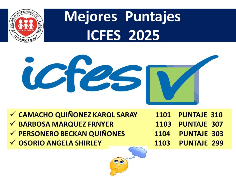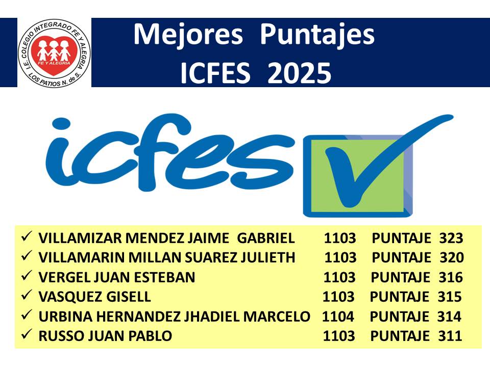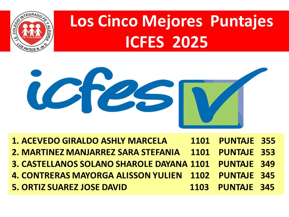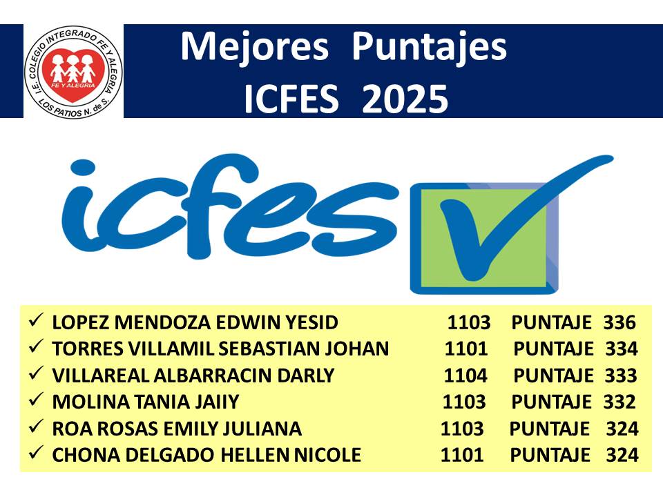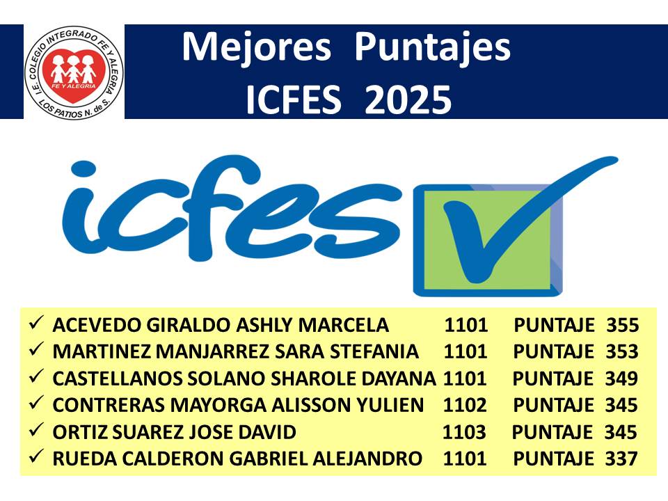 Martes 14 de Octubre 2025. Felicitaciones a la Estudiante Ashly Marcela Acevedo Giraldo por Haber obtenido el Mejor Puntaje ICFES 2025 (355/500) de La Institución Educativa Integrado Fe y Alegría del Municipio Los Patios. También felicitamos a los demás Estudiantes que obtuvieron Puntajes por encima de 300/500. Celebrando su dedicación, compromiso y disciplina.